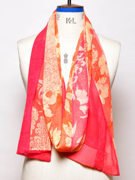 One-of-a-kind scarf created from a patchwork of original handprinted fabrics from Georgia's textile archives. This reservable scarf is designed to be worn either side with both front and back being a unique combination of fabrics.